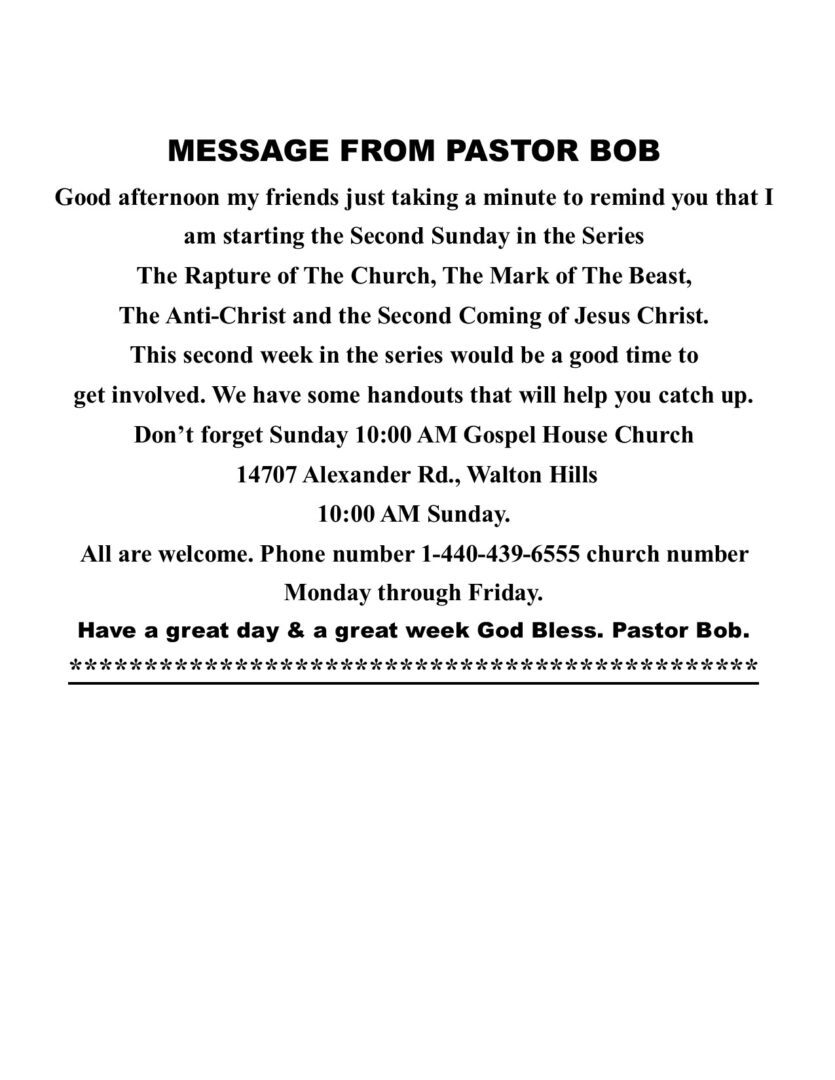 MESSAGE FROM PASTOR BOB